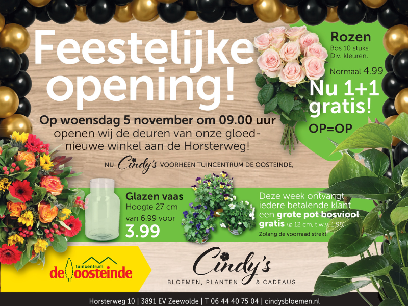 Zeewolde - Op woensdag 5 november om 09.00 uur opent in hartje Zeewolde de nieuwe bloemenwinkel ‘Cindy’s bloemen, planten & cadeaus’ feestelijk haar deuren. De winkel is gevestigd aan de Horsterweg 10, direct naast de Albert Heijn. Ter gelegenheid van de opening zijn er leuke openingsaanbiedingen en ontvangt iedere betalende klant, zolang de voorraad strekt, een cadeautje.